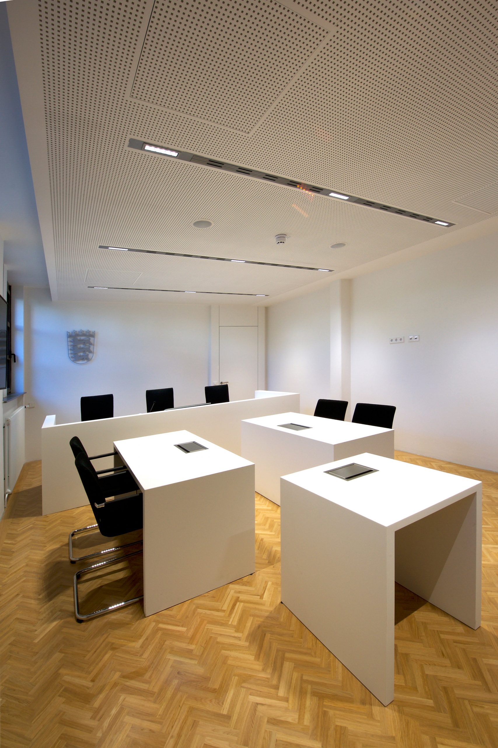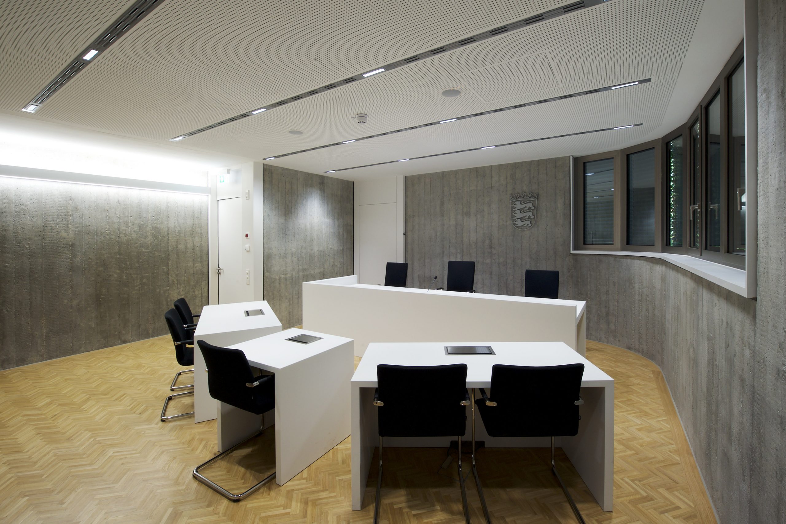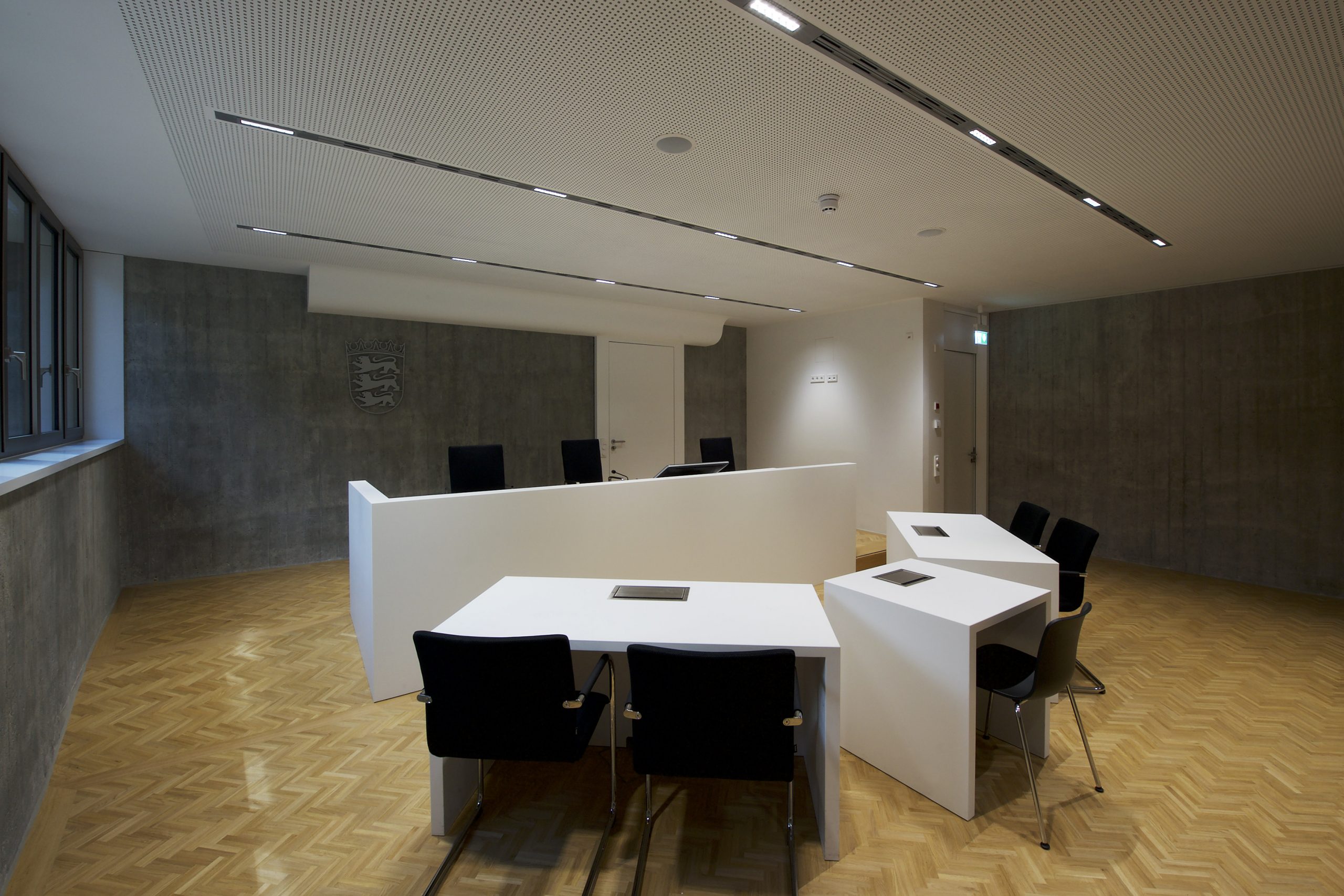 Ganz im Sinne von Justitia wurde dieser Gerichtssaal realisiert: sachlich, beständig, unparteiisch. Die Gestaltung soll selbst in angespannten Situationen Orientierung geben. Schlichtheit, die schlichtend wirkt. Für das Amtsgericht Ulm entstanden Richtertische, Beteiligten- und Zeugentische in einem fugenlos wirkenden Design aus mattem Mineralwerkstoff – für minimale Lichtreflexion und maximale Neutralität. Jedes Element wurde millimetergenau gefertigt, Medienanschlüsse versenkbar integriert, Revisionsöffnungen dezent eingebunden. Makellos geschliffene Flächen verleihen optische Ruhe und zeigen Präzision. Die Materialien sind besonders pflegeleicht, robust und belastbar. Gemacht für den täglichen Einsatz und dafür, auch in vielen Jahren noch genauso beständig zu wirken wie heute.
