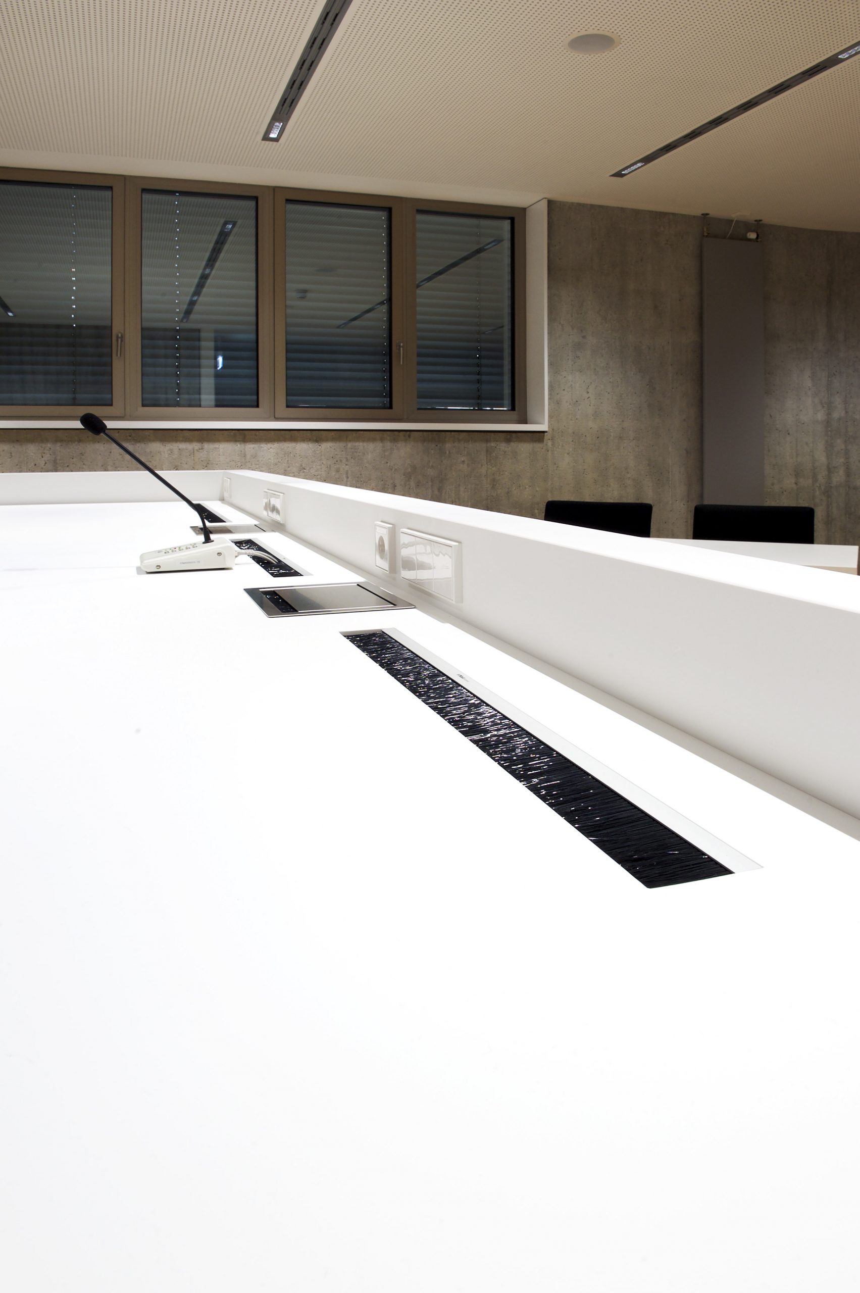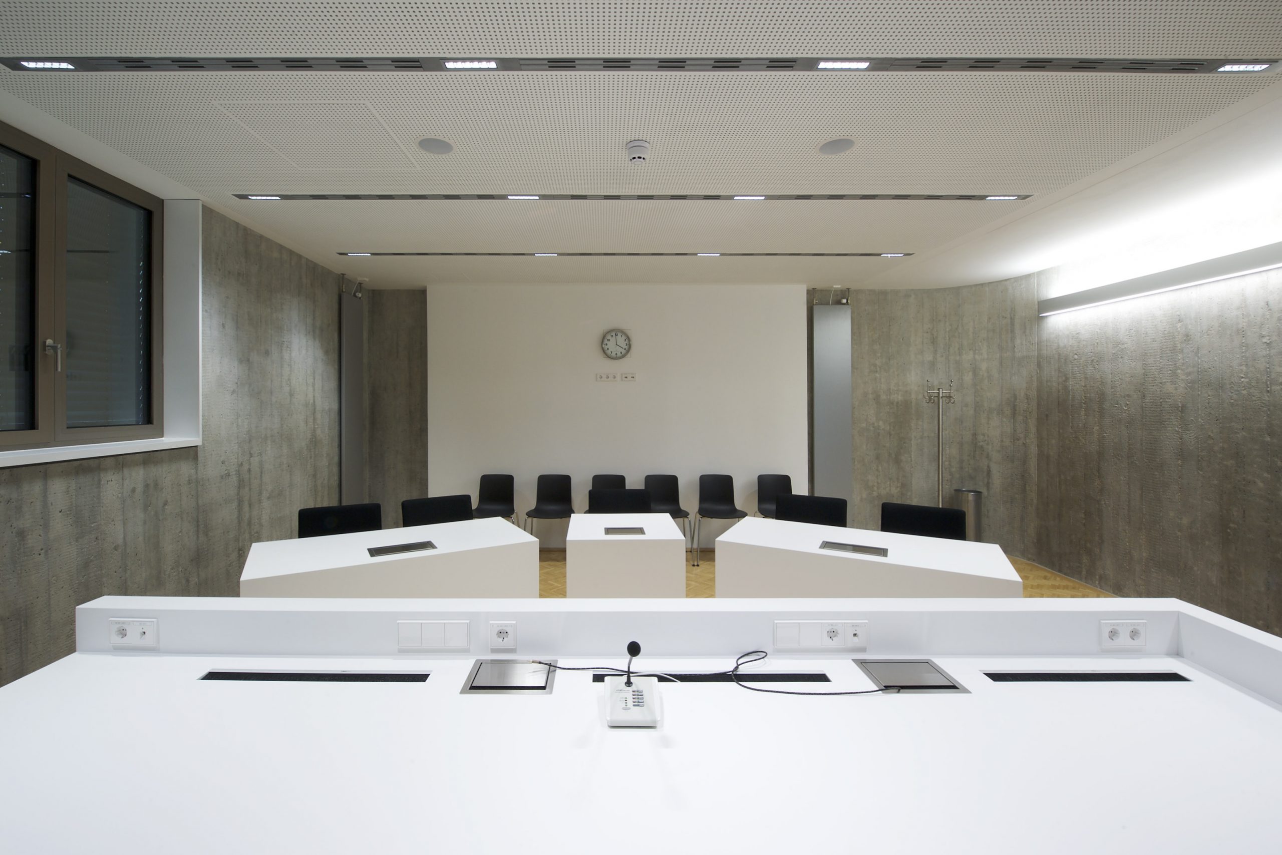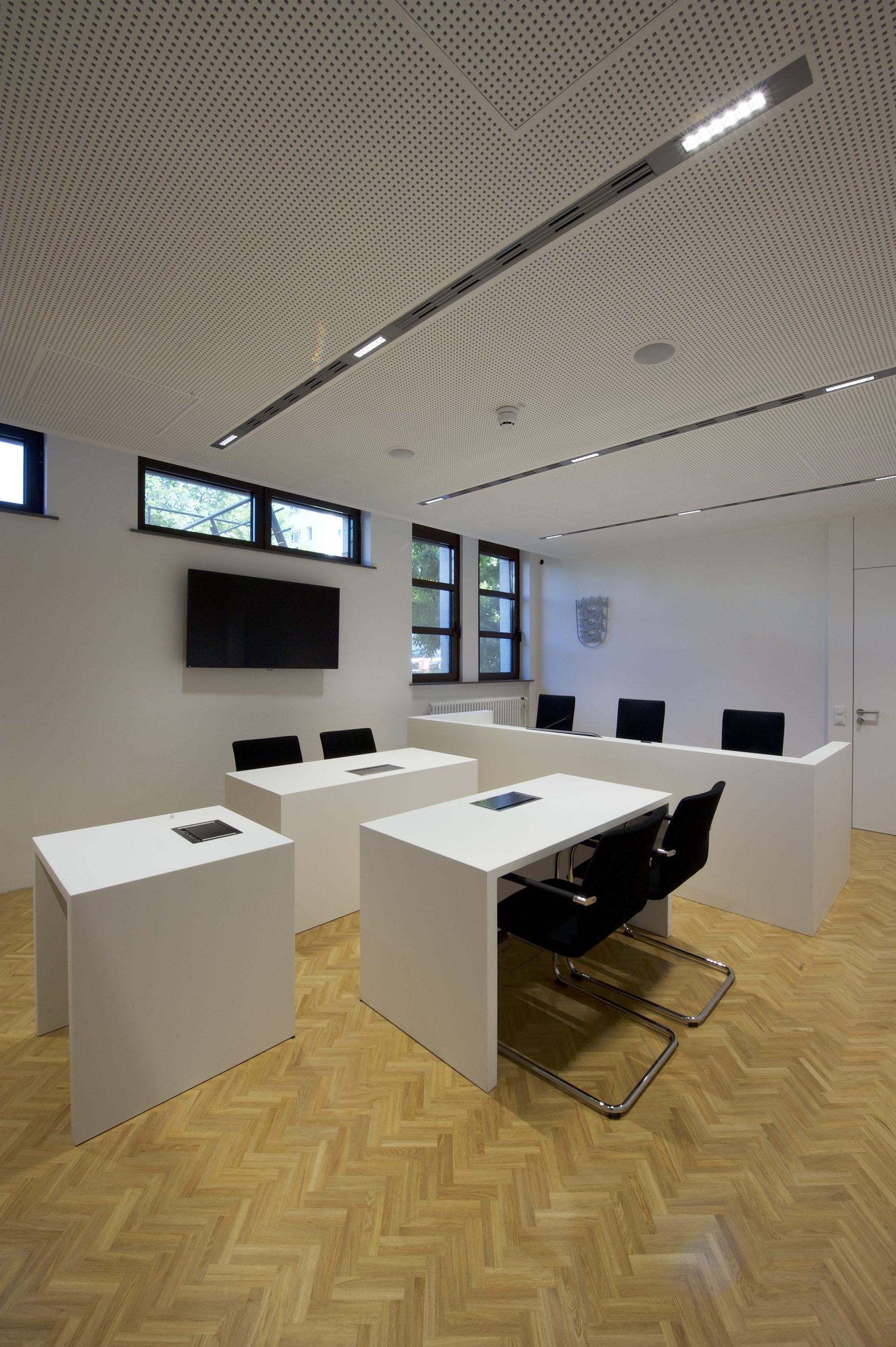 Ganz im Sinne von Justitia wurde dieser Gerichtssaal realisiert: sachlich, beständig, unparteiisch. Die Gestaltung soll selbst in angespannten Situationen Orientierung geben. Schlichtheit, die schlichtend wirkt. Für das Amtsgericht Ulm entstanden Richtertische, Beteiligten- und Zeugentische in einem fugenlos wirkenden Design aus mattem Mineralwerkstoff – für minimale Lichtreflexion und maximale Neutralität. Jedes Element wurde millimetergenau gefertigt, Medienanschlüsse versenkbar integriert, Revisionsöffnungen dezent eingebunden. Makellos geschliffene Flächen verleihen optische Ruhe und zeigen Präzision. Die Materialien sind besonders pflegeleicht, robust und belastbar. Gemacht für den täglichen Einsatz und dafür, auch in vielen Jahren noch genauso beständig zu wirken wie heute.