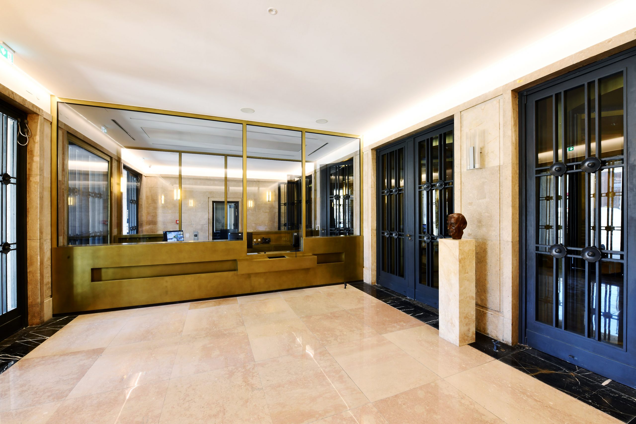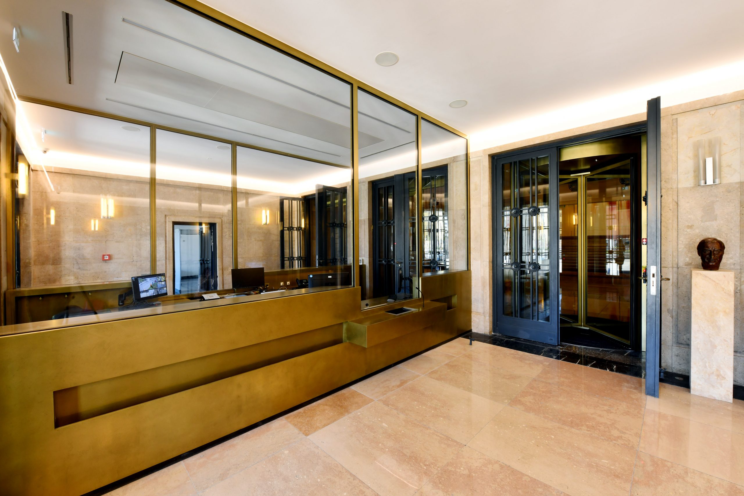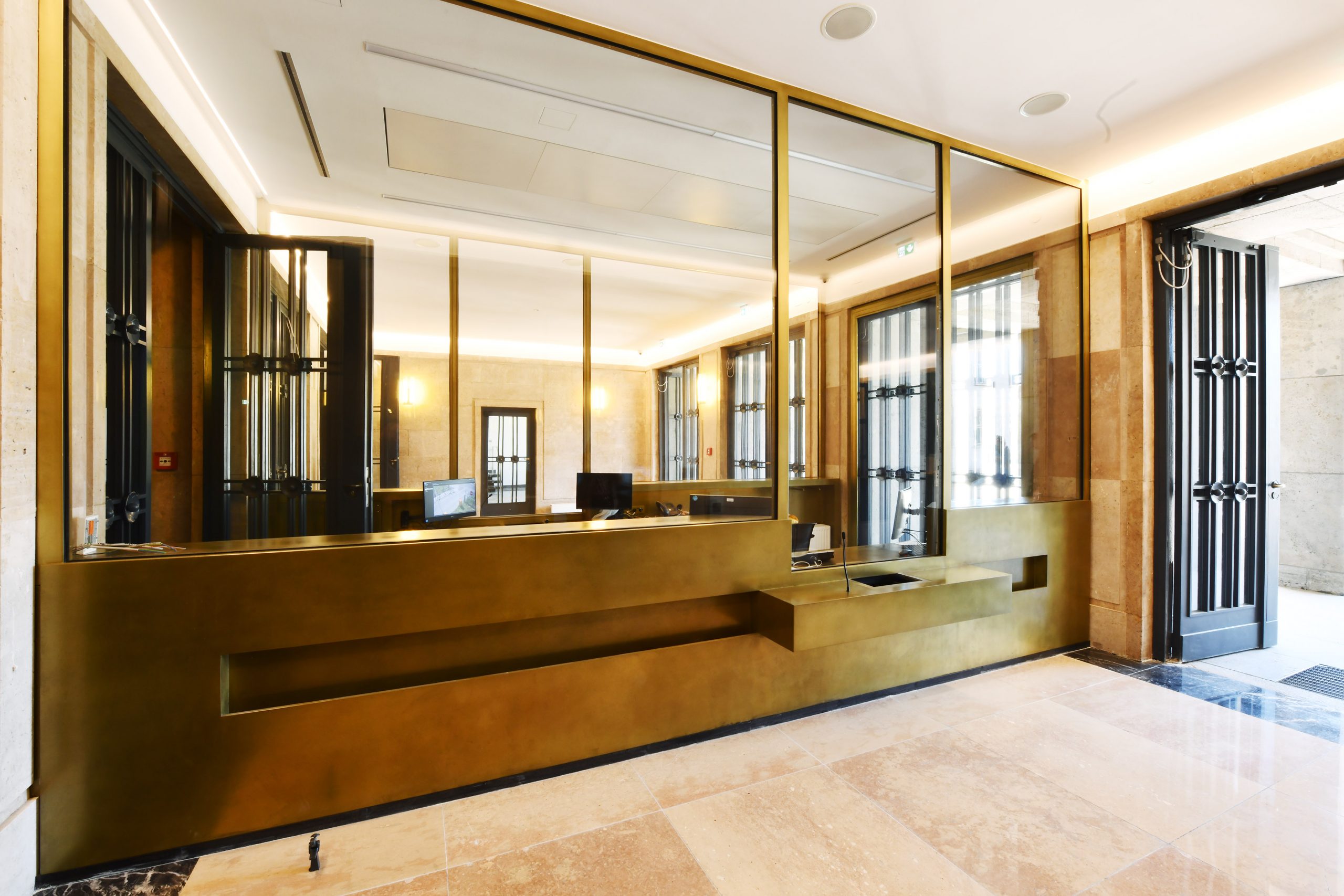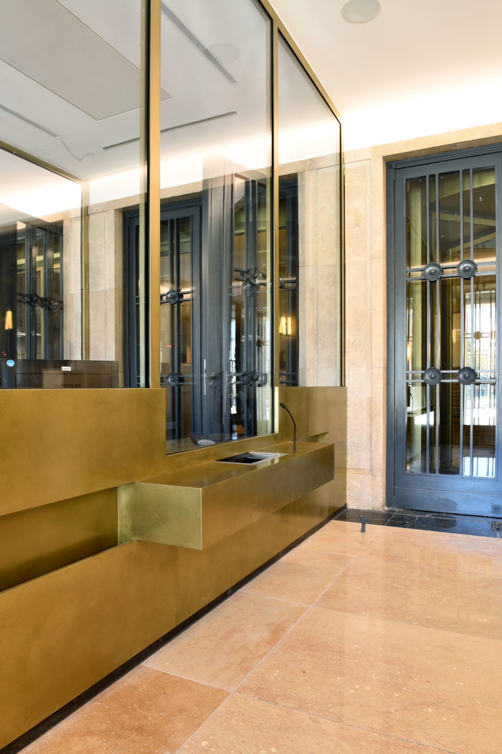 Ein Empfang, der schützen soll, aber nicht auf Eleganz verzichtet: schusssicher, schalldicht, brandschutzkonform, medientechnisch vernetzt – und dennoch offen, ruhig und repräsentativ. Auch funktionale Details wurden mitgedacht. So verbergen sich Heizkörper dezent in Sitzbänken mit pulverbeschichteten Lüftungsgittern. Alles gestalterisch abgestimmt zum Rest des Raumes. Die Herausforderung bei der Planung und Umsetzung dieses Entrées lag in der Balance: massive Einbauten mit höchster Sicherheitsstufe so zu gestalten, dass sie einladend wirken und sich harmonisch in die Architektur fügen. Ein mit Flüssigmetall beschichteter, messingfarbener Tresen trifft auf Panzerglas und integrierte Steuertechnik – technisch komplex, aber edel im Auftritt. So entsteht ein Raum, der Sicherheit bietet und zugleich Souveränität ausstrahlt.