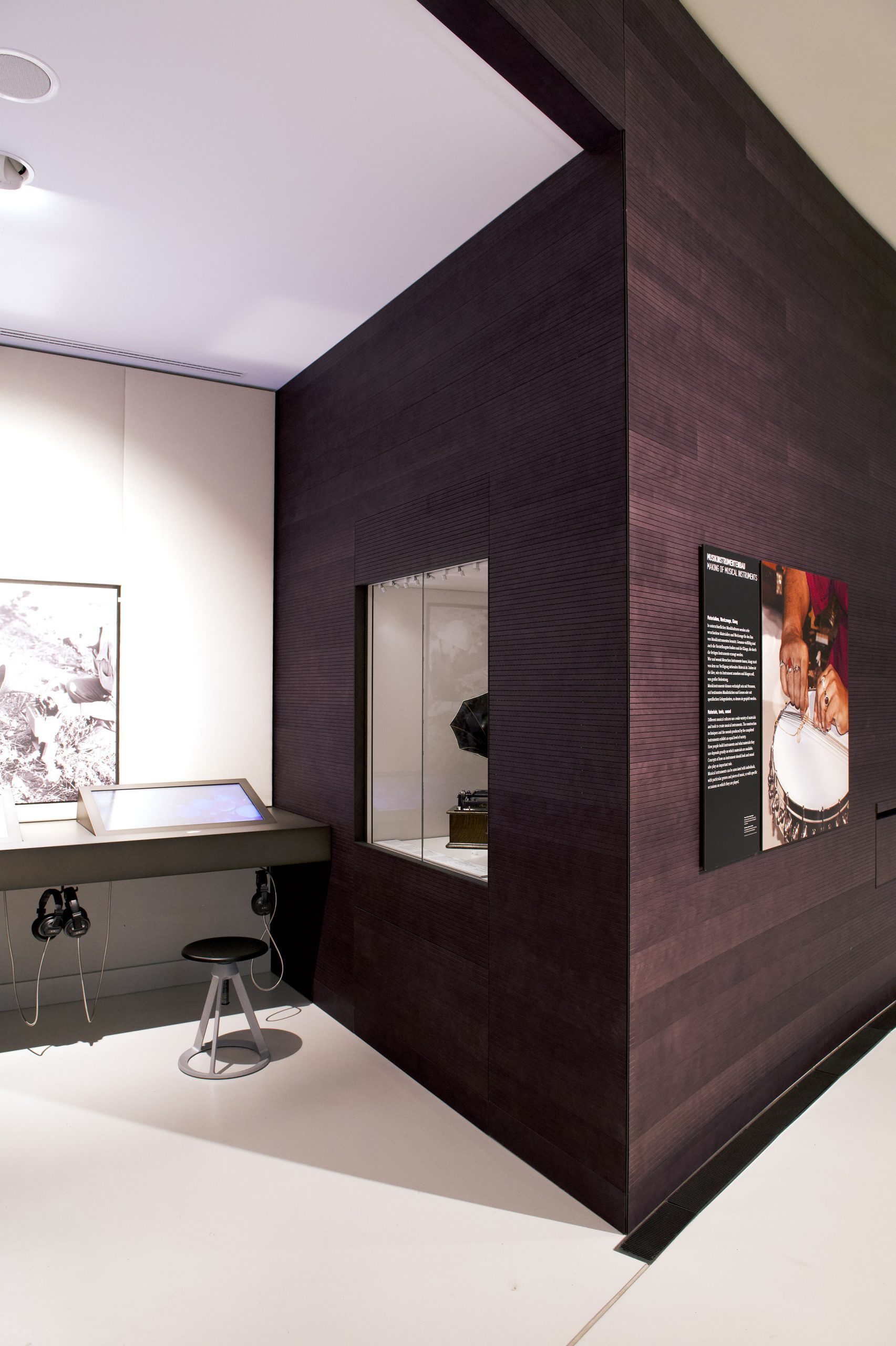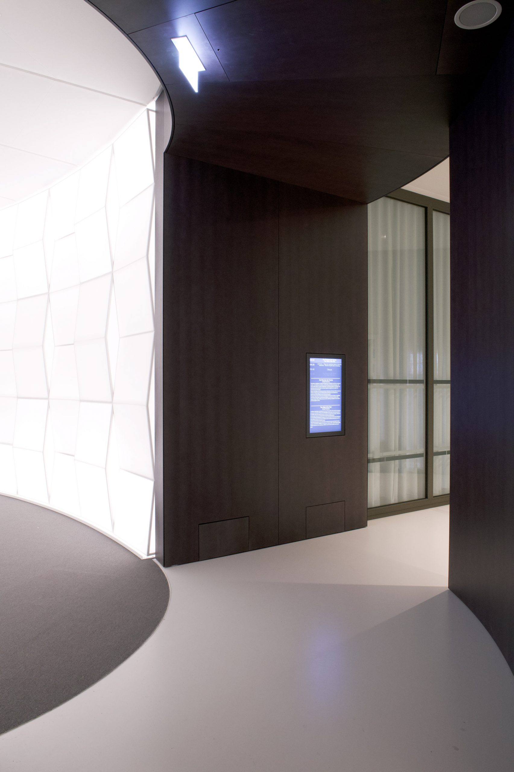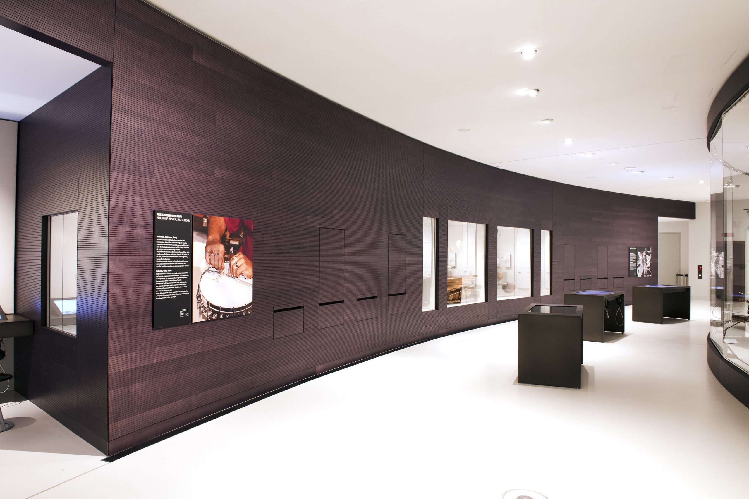 In einem Museum zählt jedes Detail – für das Besuchererlebnis und für die Präsentation der Exponate. Die ellipsenförmige Grundstruktur des Objektes verlangte höchste Präzision in der Umsetzung: gebogene Formen, perfekte Symmetrie, millimetergenaue Übergänge. Alle Fronten wurden aus mehreren Schichten in eine fließende Bogenform gebracht. Dieses Projekt beweist, dass auch Brandschutz und Technik sich elegant integrieren lassen. Jedes eingesetzte Material erfüllt eine Aufgabe, die visuell und funktional wirkt. Gebeiztes Holz, schwarz eloxiertes Metall, schallabsorbierende Flächen, elegant integrierte Stahl-Vitrinen und fein abgestimmte Lichtführung schaffen Klarheit und geben Sicherheit.