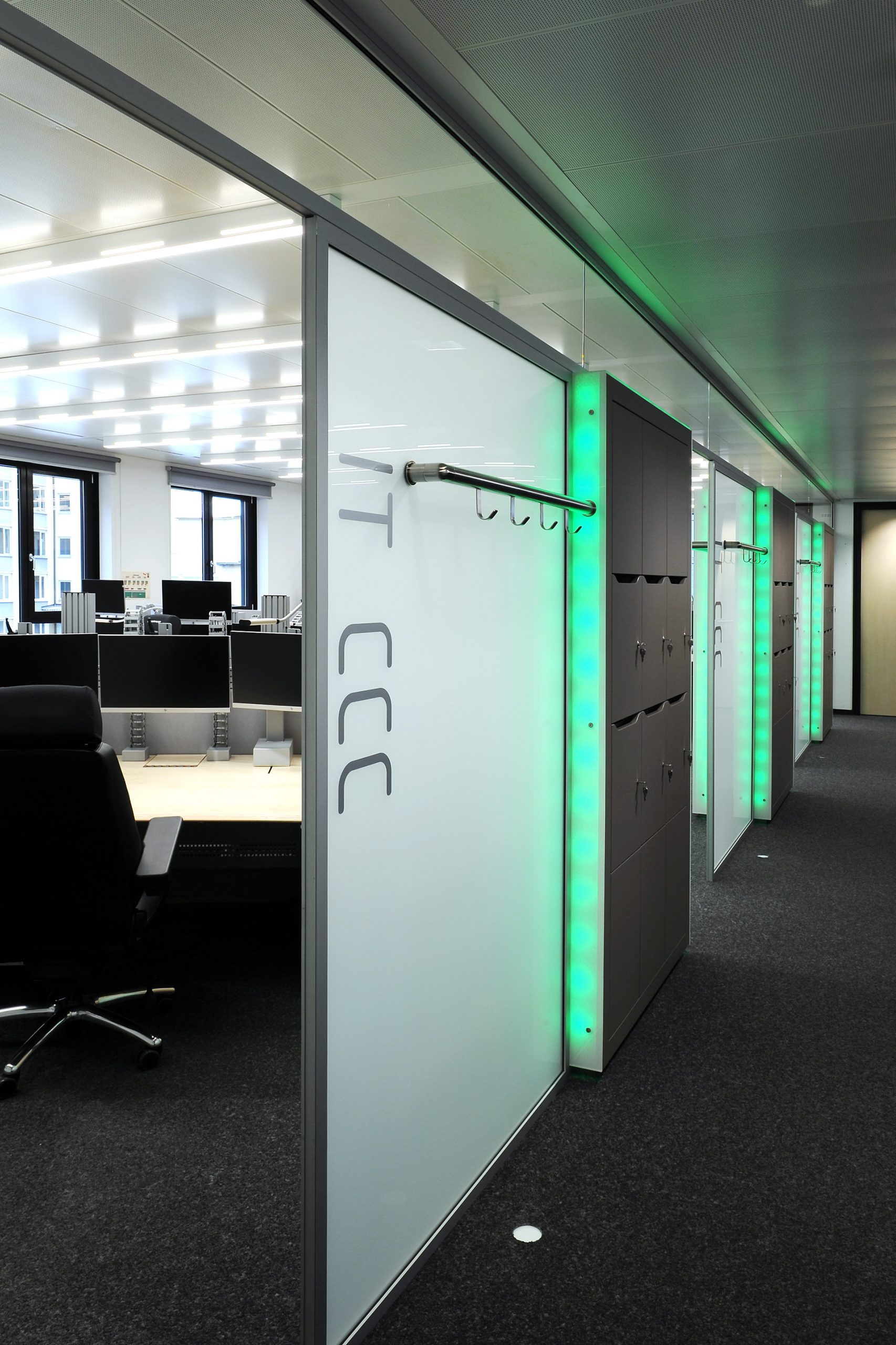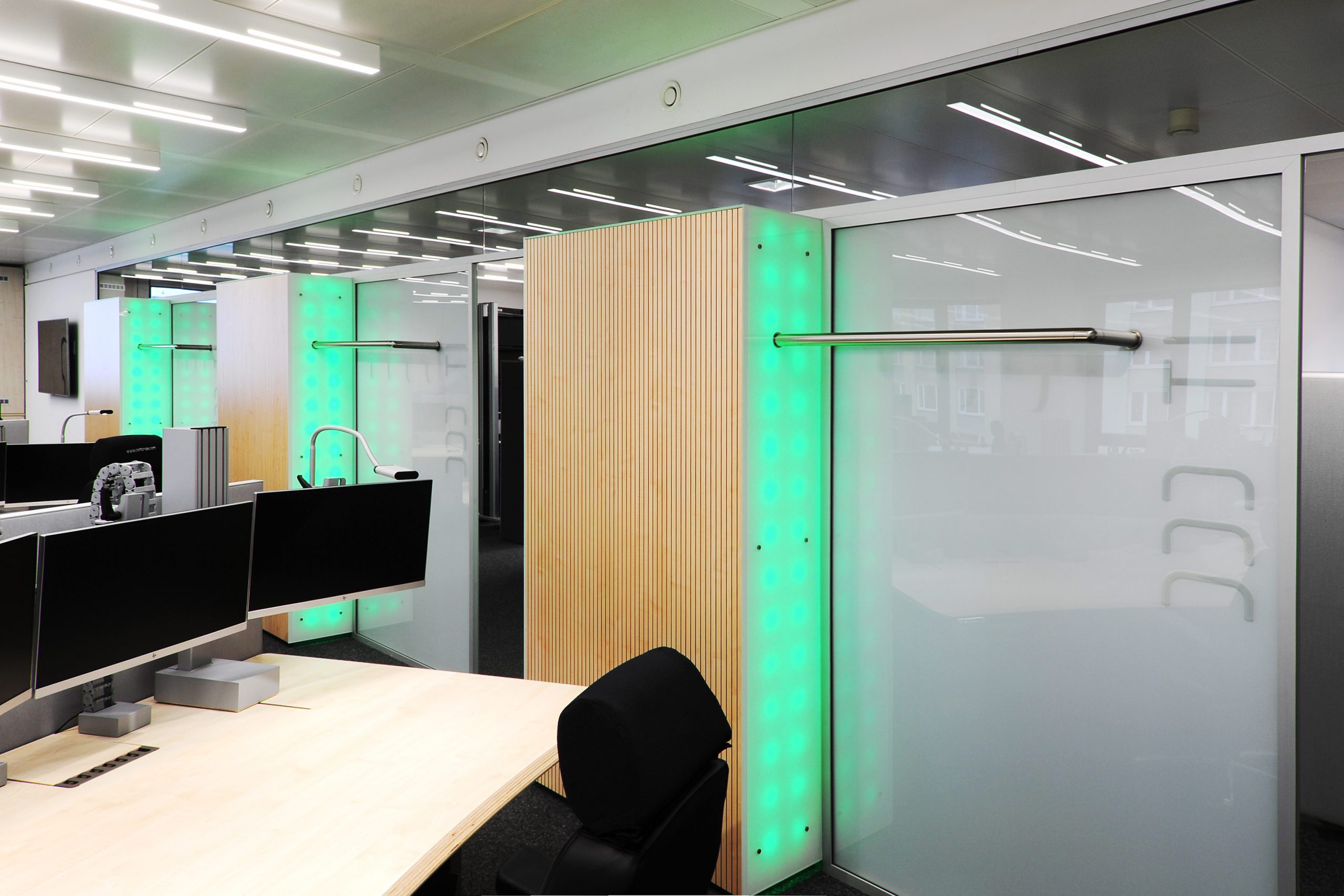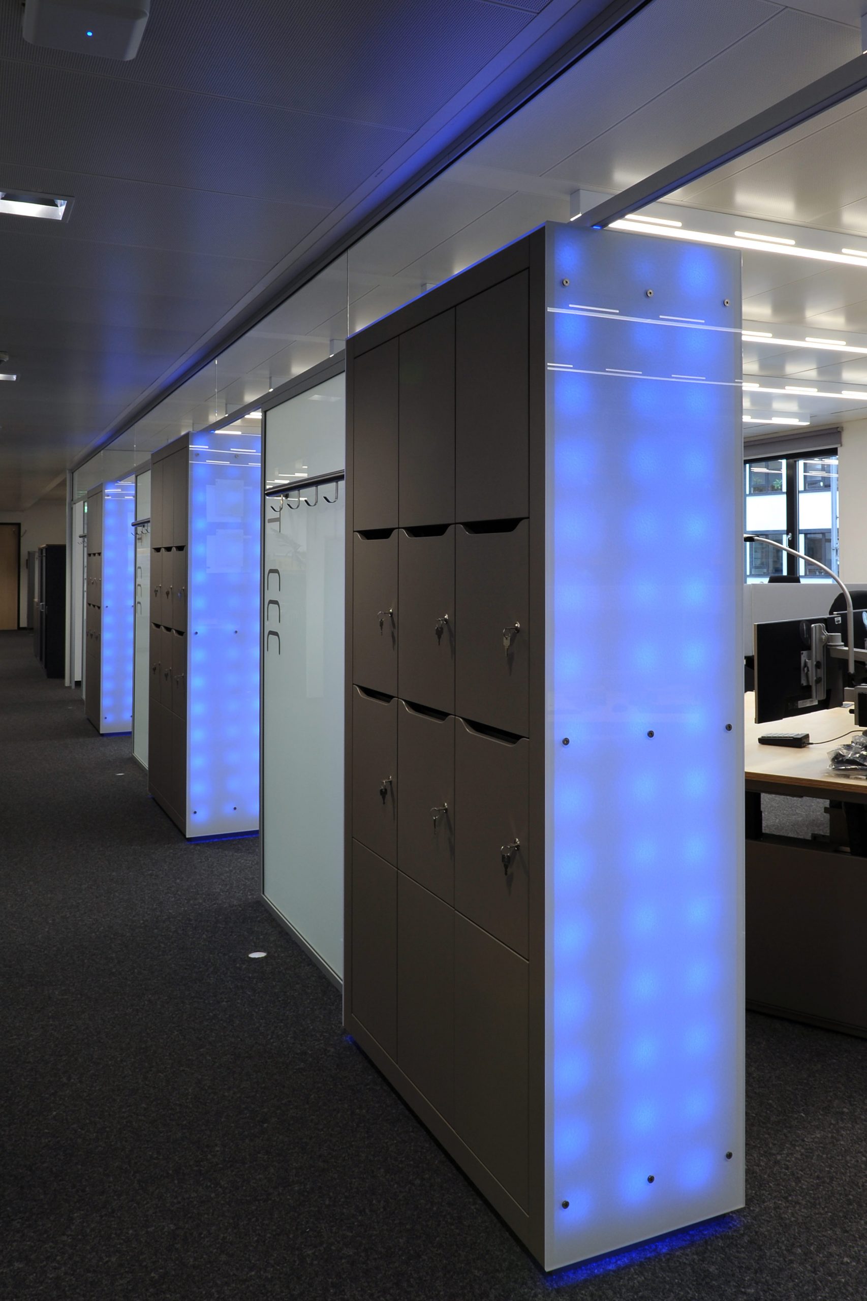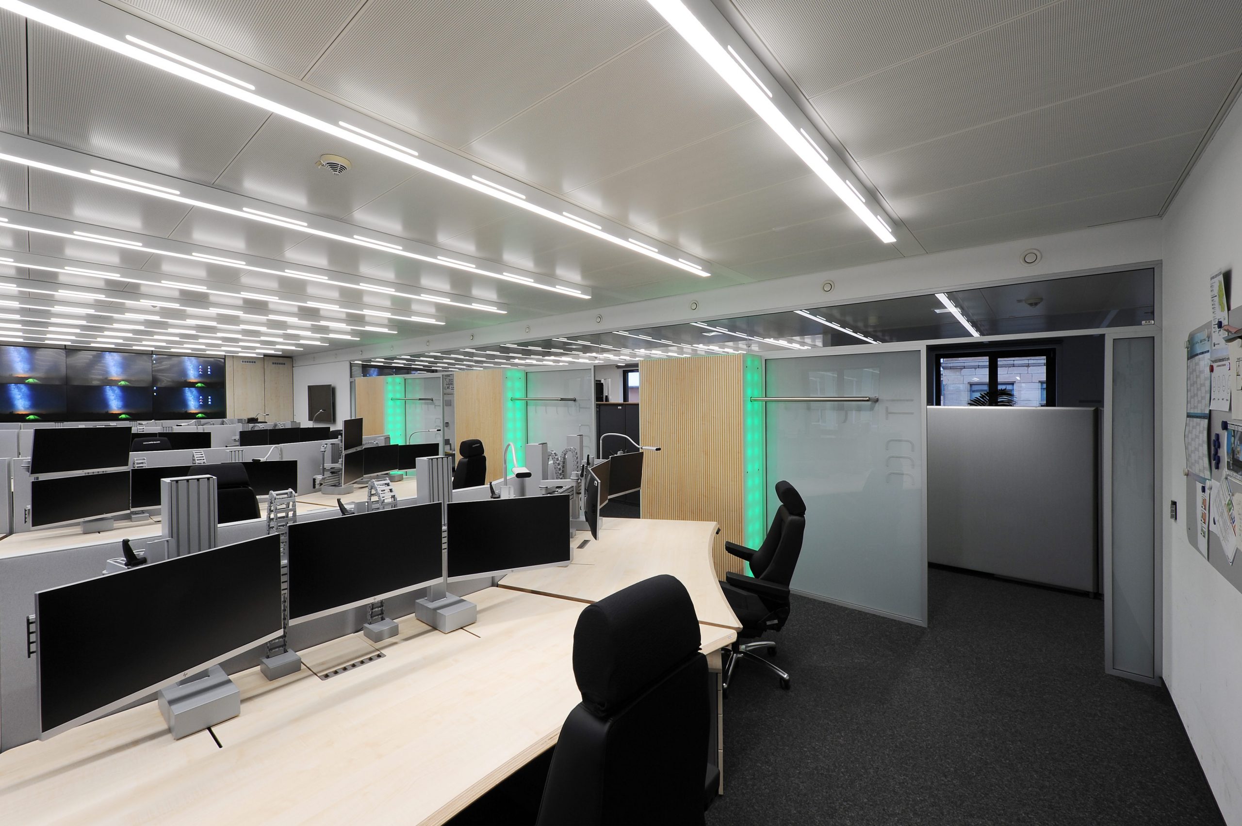 In einer IT-Leitwarte zählt jede Sekunde. Dieser Raum ist auf Reaktionsfähigkeit programmiert – technisch, funktional und atmosphärisch. 24/7 einsetzbare Leitstellentische, höhenverstellbar und ergonomisch, machen schnelles Handeln zum Standard. Monitorwände, Trennwände mit schaltbarem Glas, steuerbare Lichtsysteme und präzise Akustiklösungen schaffen visuell wie auditiv Klarheit. Alles ist durchdacht: von der programmierbaren Lichtsteuerung bis zu den personalisierten Wertfächern, in denen Mitarbeitende ihr Equipment sofort griffbereit haben. Sämtliche integrierte Funktionen sorgen zu jeder Zeit für konzentriertes und angenehmes Arbeiten.