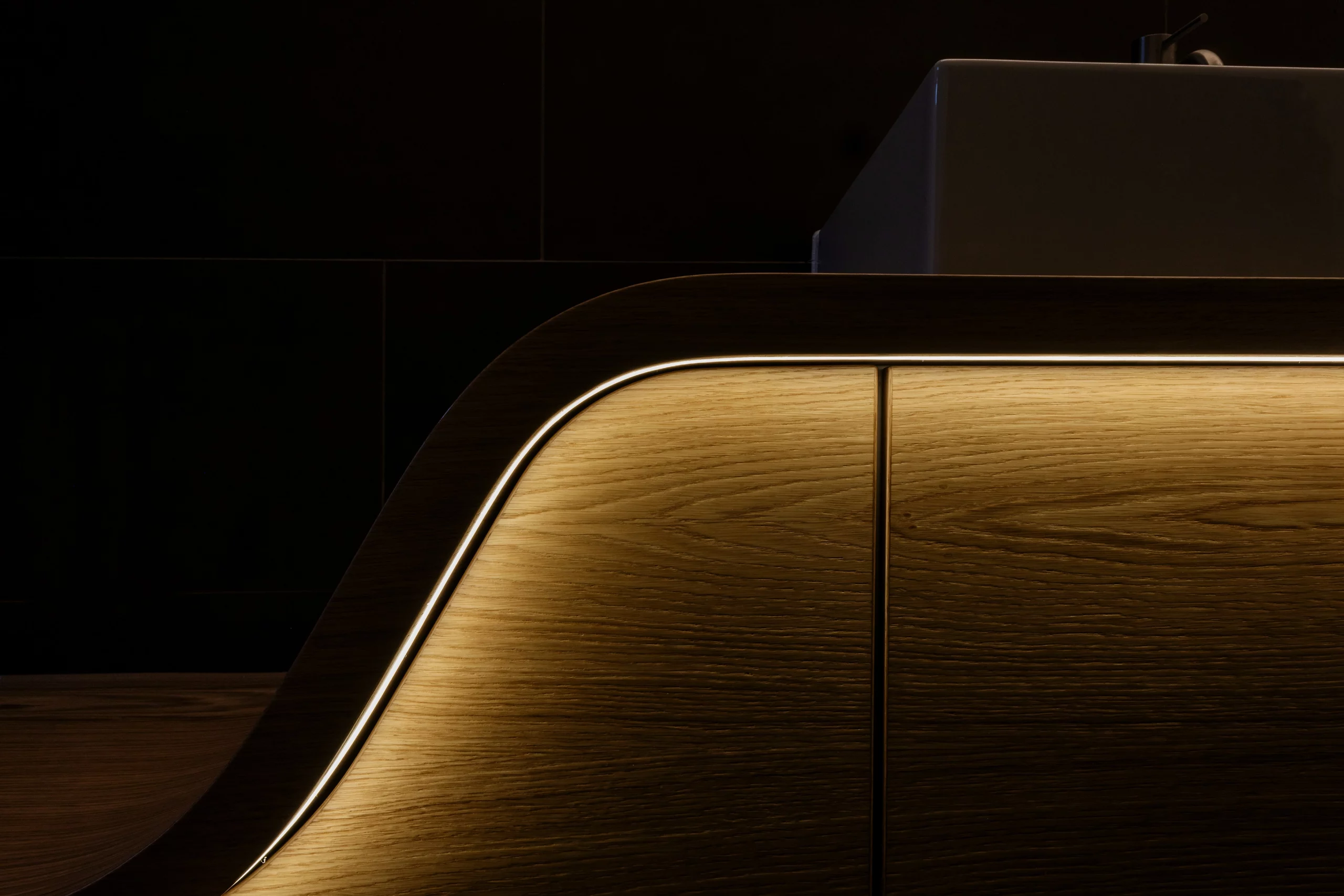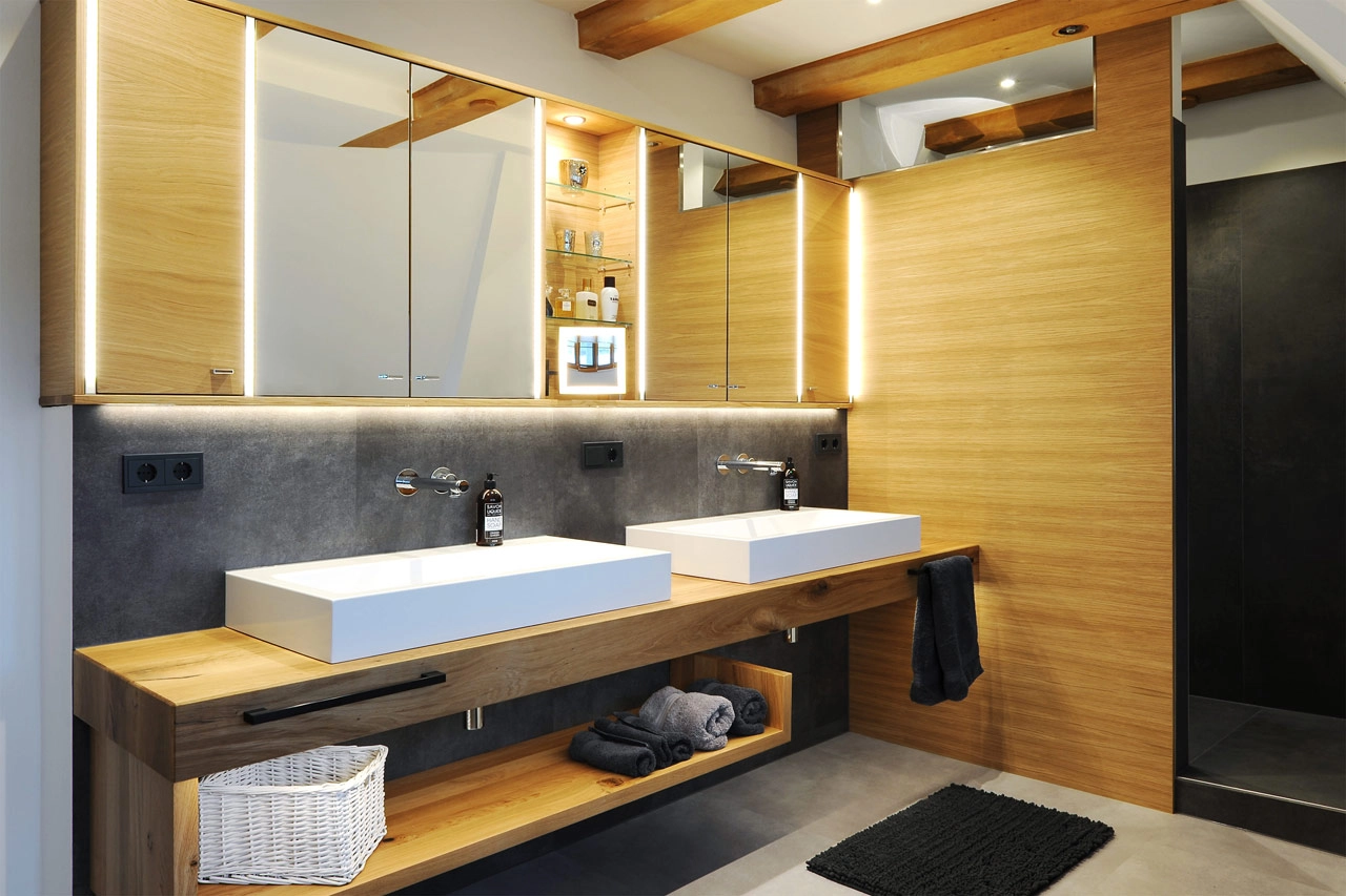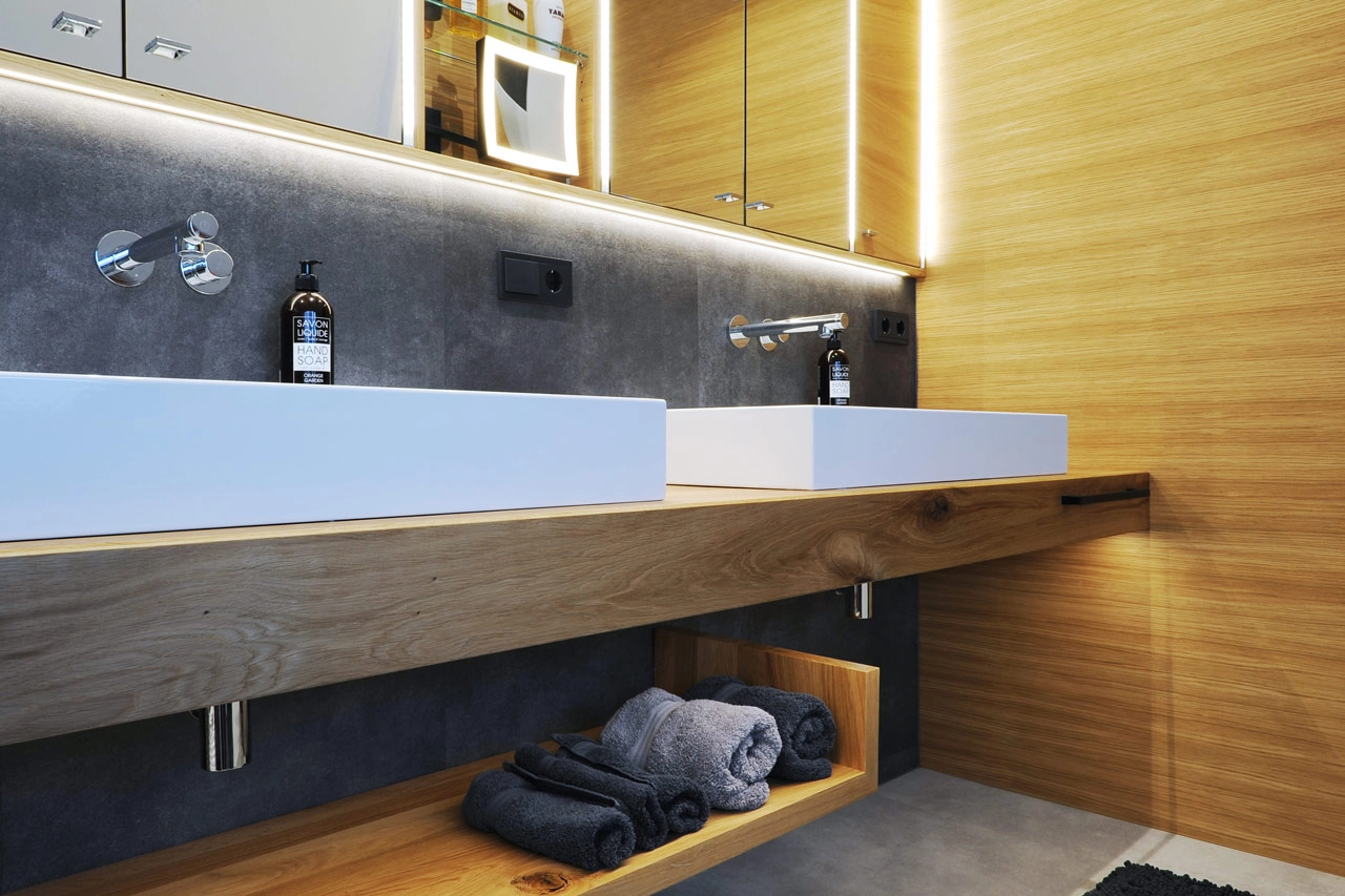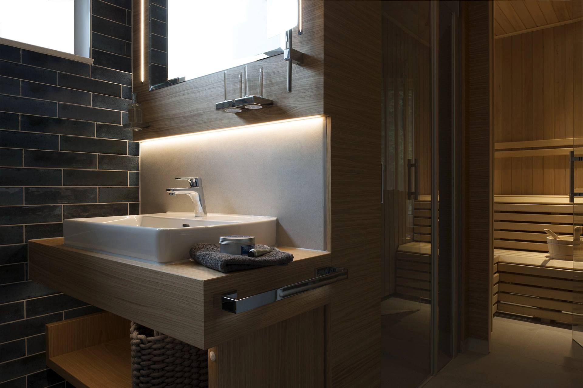 Hier ankommen bedeutet, den Alltag hinter sich zu lassen und die Zeit zu vergessen. Ein hochwertiges Bad ist zeitlos gestaltet und erstklassig in seiner Funktion. Schwebende Möbel geben dem Raum Leichtigkeit. Die Technik im Hintergrund denkt in jedem Moment mit: beim nächtlichen Licht, beim sanften Öffnen und Schließen der Möbel und Türen, bei der Privatsphäre mit Priva-Light-Trennwänden oder beim Infrarot-beheizten Spiegel, der auch bei erhöhter Luftfeuchtigkeit nie mehr beschlägt und wohltuende Wärme spendet. Auch die Sauna folgt all diesen Gedanken. Mit abgeschrägten Kanten, die sich der Körperhaltung anpassen, stimmungsvoll und clever positioniertem Licht und einer exklusiven Kombination aus Infrarot und finnischer Sauna, die sich Ihrem individuellen Wunsch nach Regeneration anpasst.