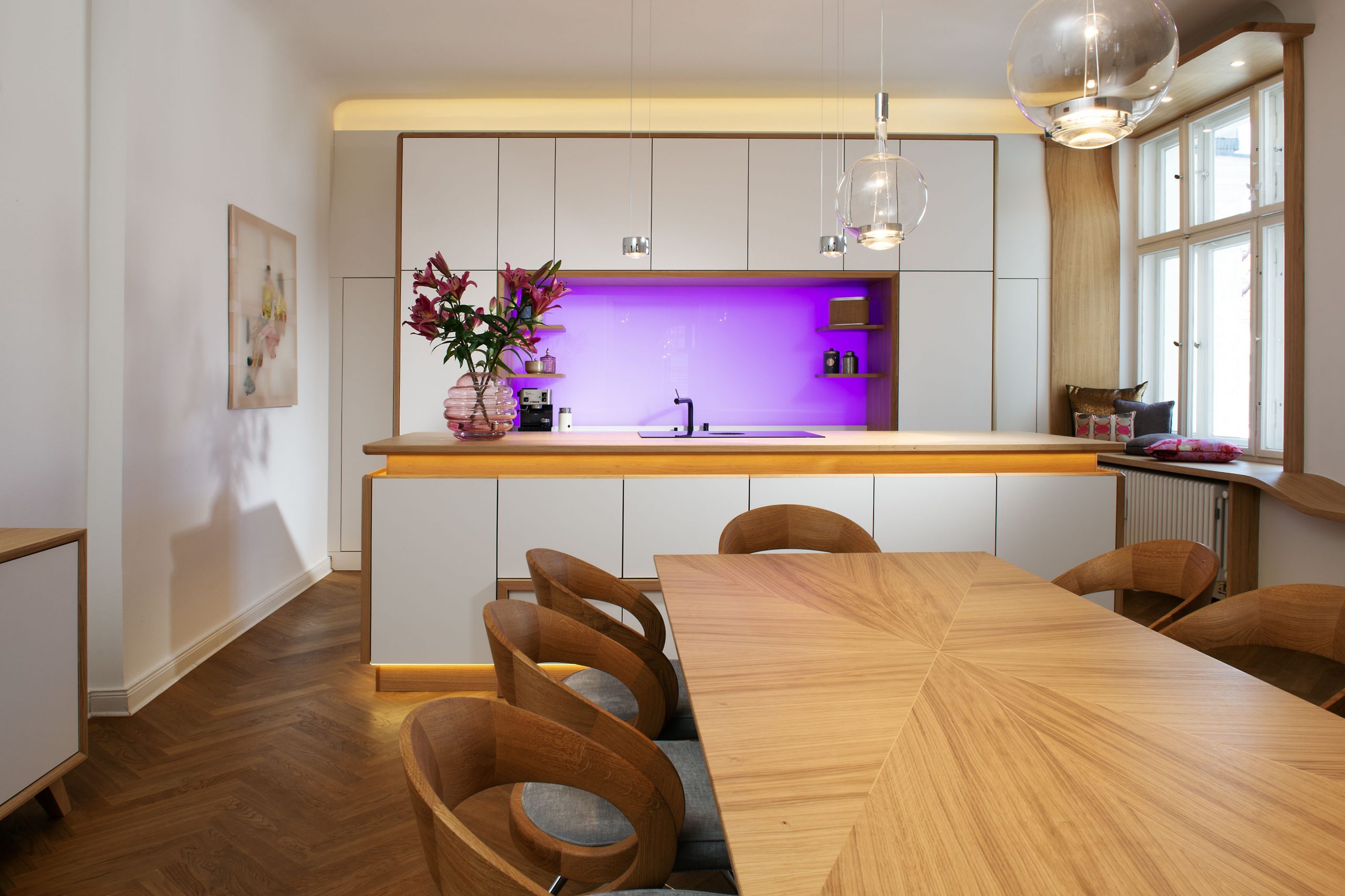 Küchen sind der lebendige Mittelpunkt eines Hauses. Was es hier braucht, ist ein Konzept, das technisch auf höchstem Niveau funktioniert und sich dabei ganz selbstverständlich anfühlt. Die eingesetzten FENIX®-Oberflächen setzen Maßstäbe in Haptik, Farbtiefe und Strapazierfähigkeit. Durch Einleimer-Kanten entsteht eine Präzisionsfuge, die Design und Natur zu einem stimmigen Ganzen verbindet. Präzise Millimeterarbeit, die aus jedem Betrachtungswinkel ihre Tiefe offenbart. Hochwertige Beschläge sorgen für lautloses Gleiten, müheloses Öffnen, spürbare Qualität. Alles greift ineinander. Präzise bis ins letzte Detail.